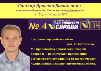 Я – Столяр Ярослав, лікар-трансфузіолог, 07.12.1971 р.н., освіта вища. Працюю заступником директора КНП «Хмельницький обласний центр служби крові». Являюсь кандидатом до Хмельницької районної ради від Політичної Партії «За конкретні справи» по виборчому округу №6 (м. Хмельницький, Лісовогринівецька ТГ, Аркадіївецька ТГ, Гнатовецька ТГ, Читати далі