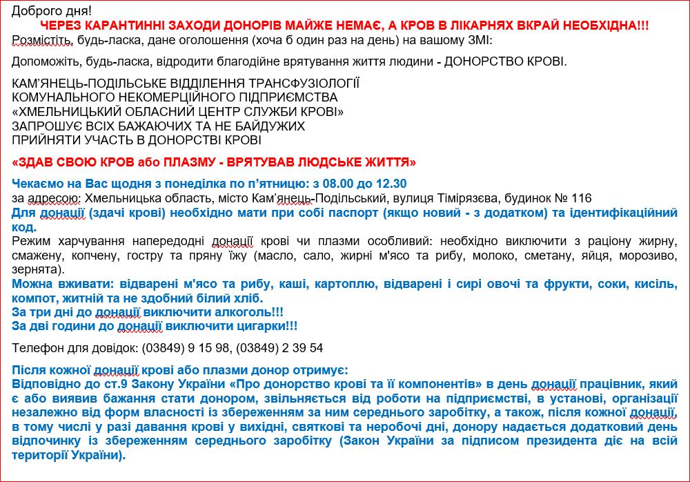 Листівка про донорство – Кам’янець-Подільське відділення трансфузіології КНП “ХОЦСК”